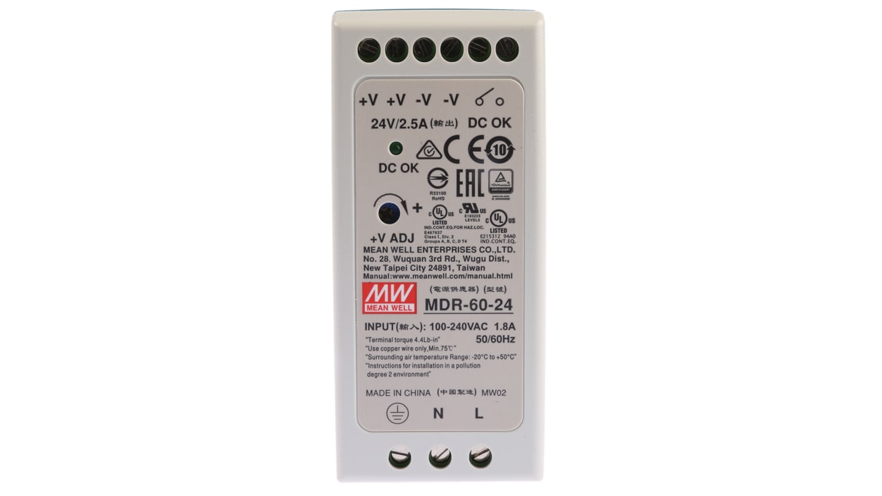 Mdr 60 24 Mean Well Mdr Switch Mode Din Rail Panel Mount Power Supply With Overvoltage And Short Circuit Protection 85 Rs Components